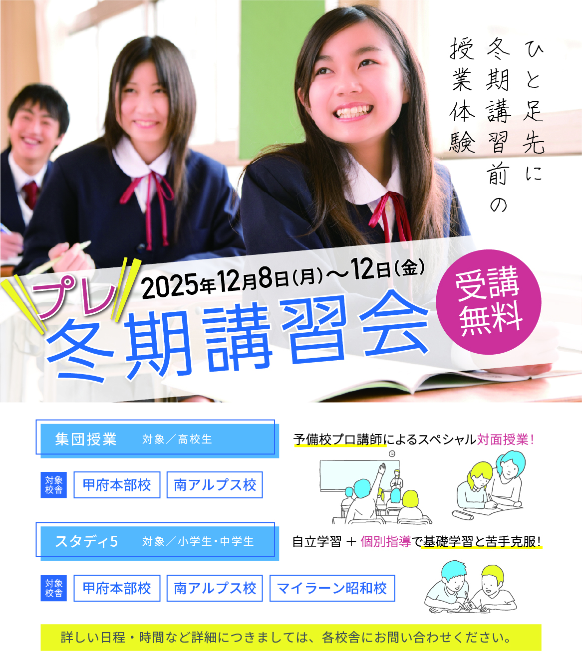 2025年10月27日 / 最終更新日 : 2025年10月27日 nishiyobi-admin 季節講習 プレ冬期講習会集団授業予備校プロ講師によるスぺシャル対面授業対象高校生・既卒生スタディ5自立学習 + 個別指導で基礎学習と苦手克服!対象中学生お申し込みはこちらWeb以外でお申込みの方は各校舎で直接お申し込みください。